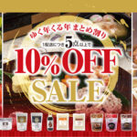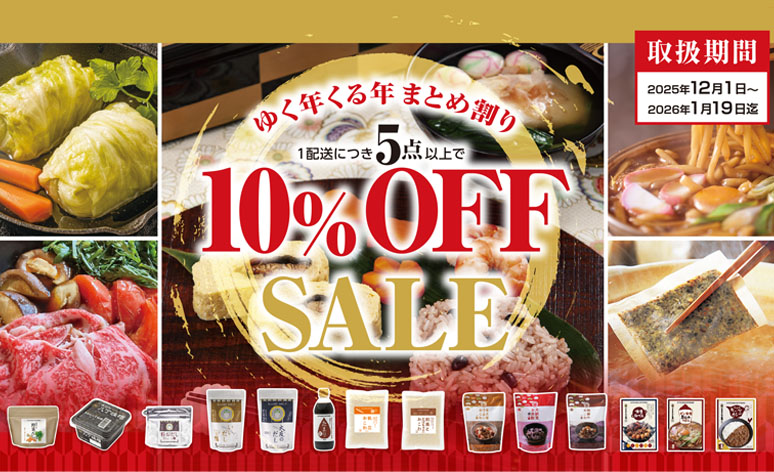 今年1年の感謝を込めまして、キッチン大友オンラインショップでは当店の人気商品を1配送につき5点以上お求めいただいた際に10%オフのお値引きをいたします。さらに、割引前6,480円以上お買い上げで送料無料となります。