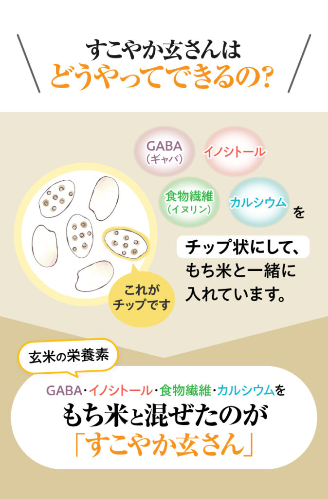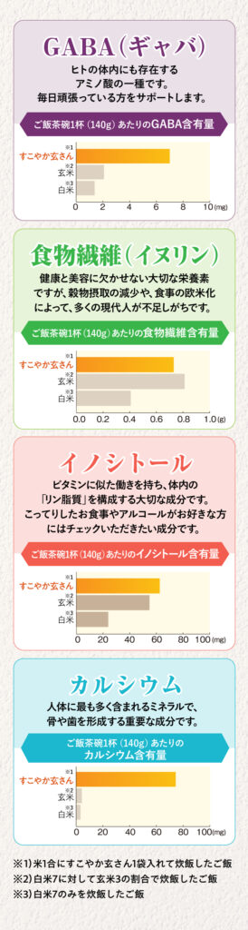原材料名:もち米(国産)、食物繊維加工品(イヌリン、植物油脂、ギャバ)/トレハロース、炭酸Ca、イノシトール、ステアリン酸Ca
