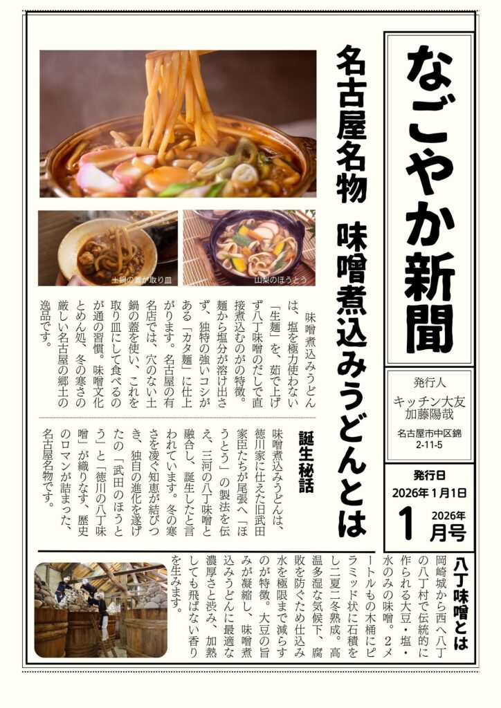 なごやか新聞1月号「名古屋名物味噌煮込みうどん」