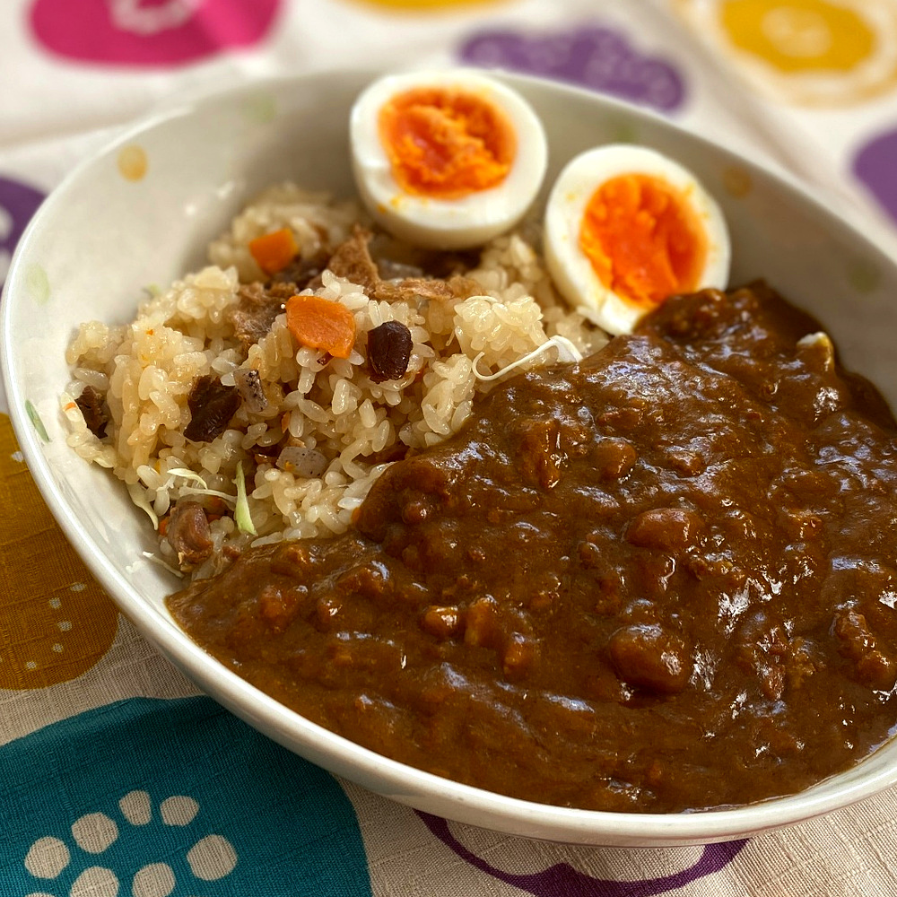 1,器に炊き上がっただし炊きおこわとキャベツの千切りをお好みの量盛り付け、温めた名古屋キーマカレーをかける。
